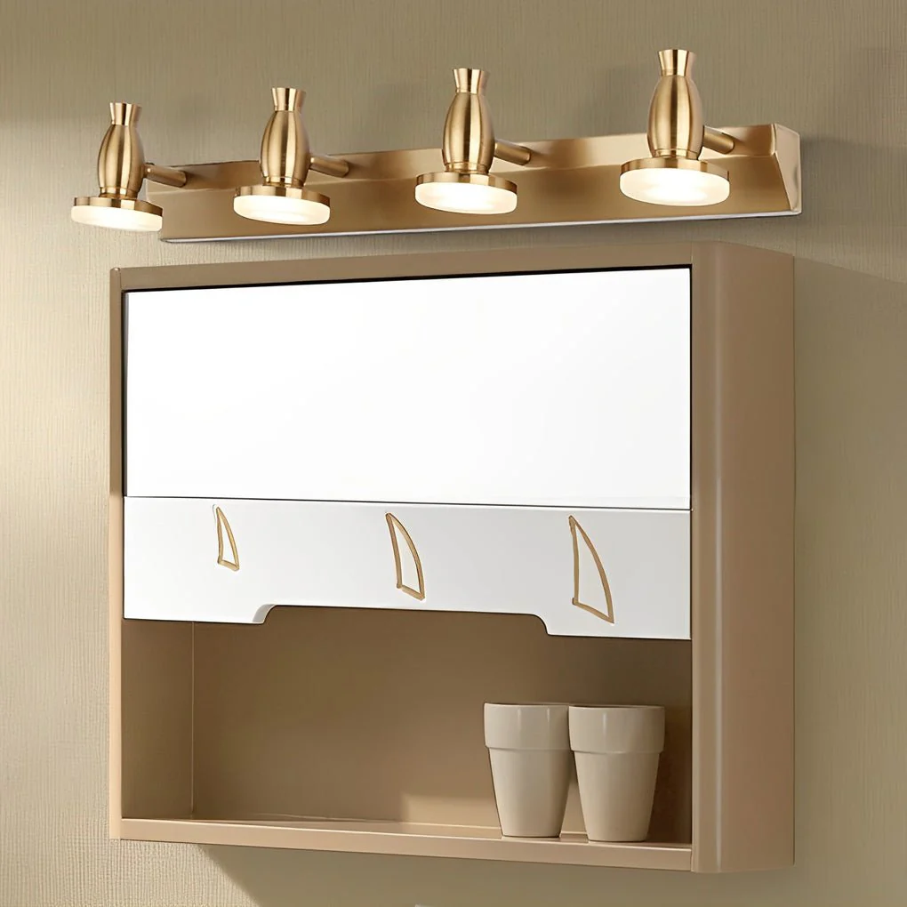 - Enhance your bathroom with this elegant gold LED vanity light featuring adjustable lamp heads that rotate 180°, providing customizable lighting angles for a variety of tasks. Crafted from electroplated metal with a polished gold finish, this fixture adds a luxurious touch to any modern or classic décor.