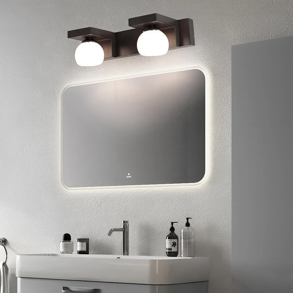 - The second design showcases elegant fixed glass dome shades, providing a soft and warm glow that complements its natural rubber wood base. Perfect for modern or rustic interiors, this light fixture comes in 2-light and 3-light options to match diverse mirror sizes and layouts.