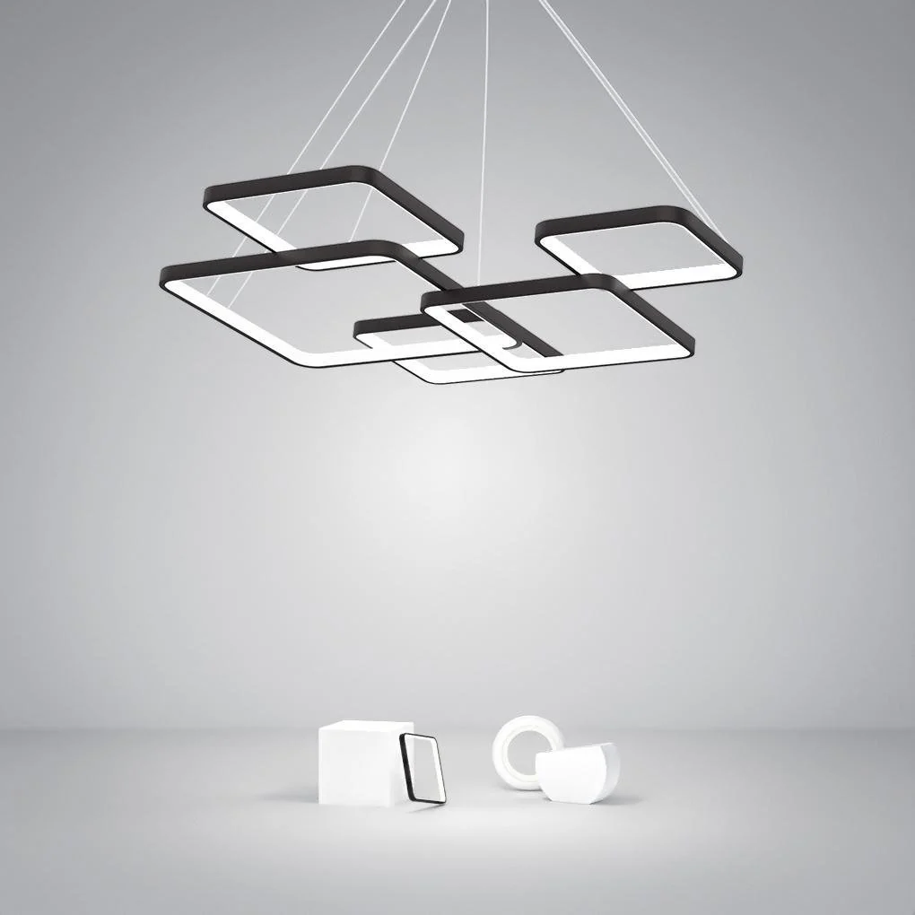 - Suspended from the ceiling, the three aluminum squares descend in small, medium, and large squares creating a design that is both precise and arbitrary. This is a look that's rarely seen in living room lighting, creating an audacious and unforgettable conversation piece.