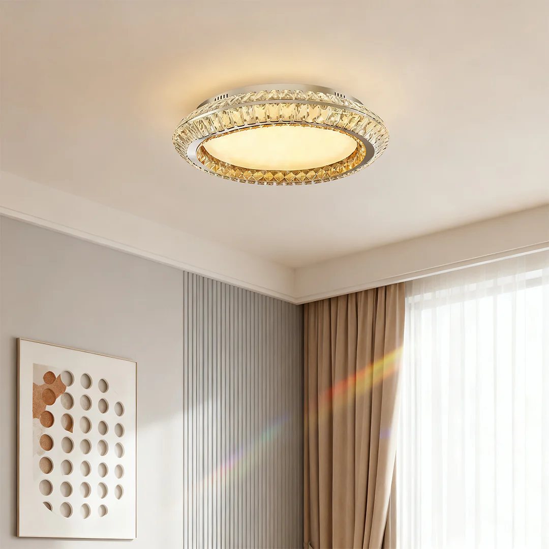 This flush mount crystal ceiling lights is available in three different sizes. The lamp body features a stainless steel frame paired with a crystal lampshade, equipped with full-spectrum LED light source that supports switching between 3000K warm light and 6000K cool light.