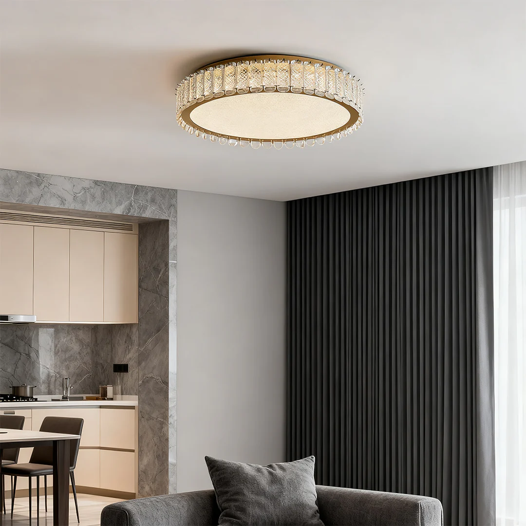 This flush mount modern lighting perfectly blends modern design with light luxury aesthetics, offering eight specifications in total, including six round models and two rectangular models. The lamp body features a high-quality chrome stainless steel frame paired with high-transparency crystal decorations. It is equipped with an efficient built-in LED light source and supports three-color temperature adjustment, creating a bright and elegant lighting environment for spaces such as living rooms, bedrooms, and studies.