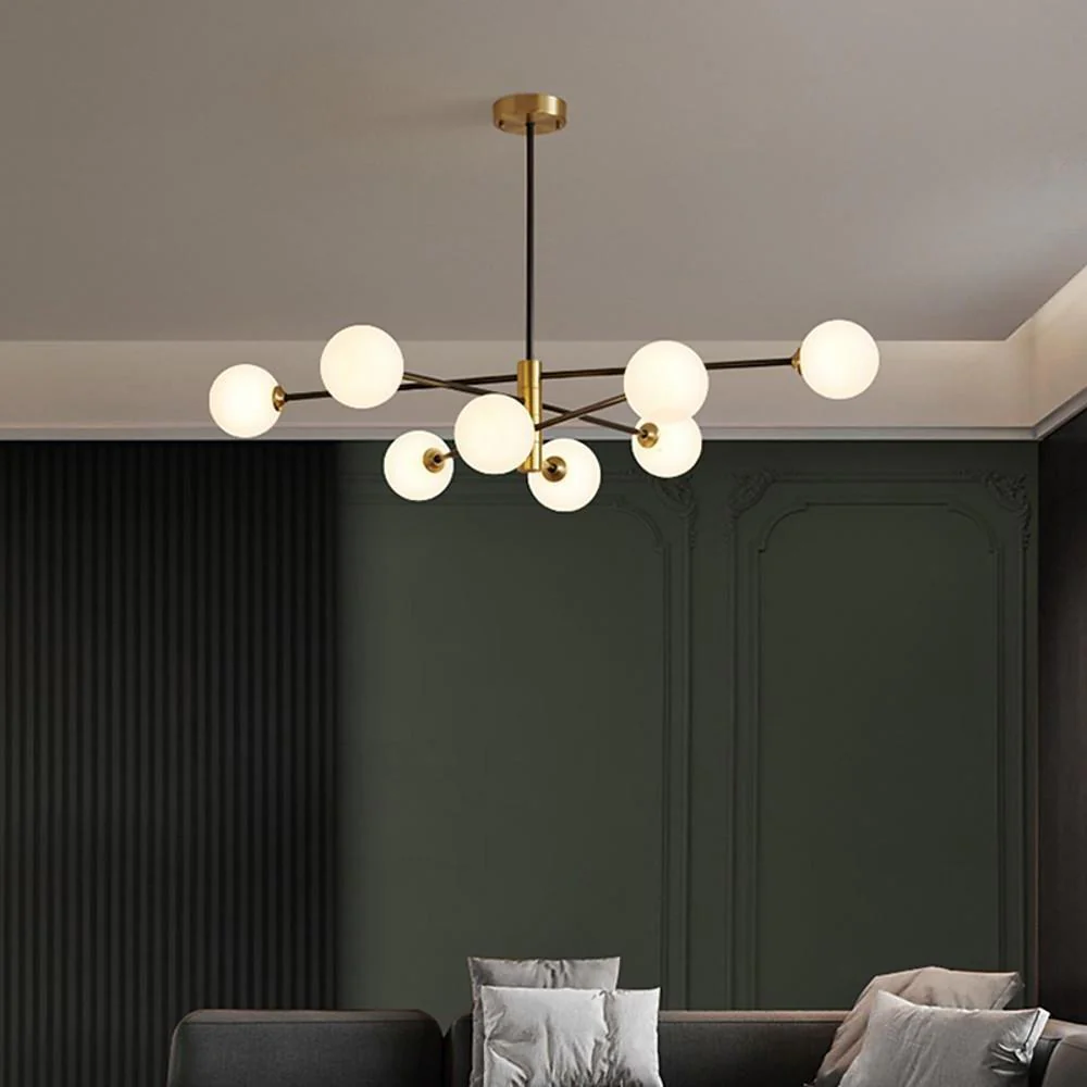 - The white ball shaped glass lampshade of this modern chandelier complements the metal lamp body, which is classic, elegant and bright, and it's perfect for home lighting.