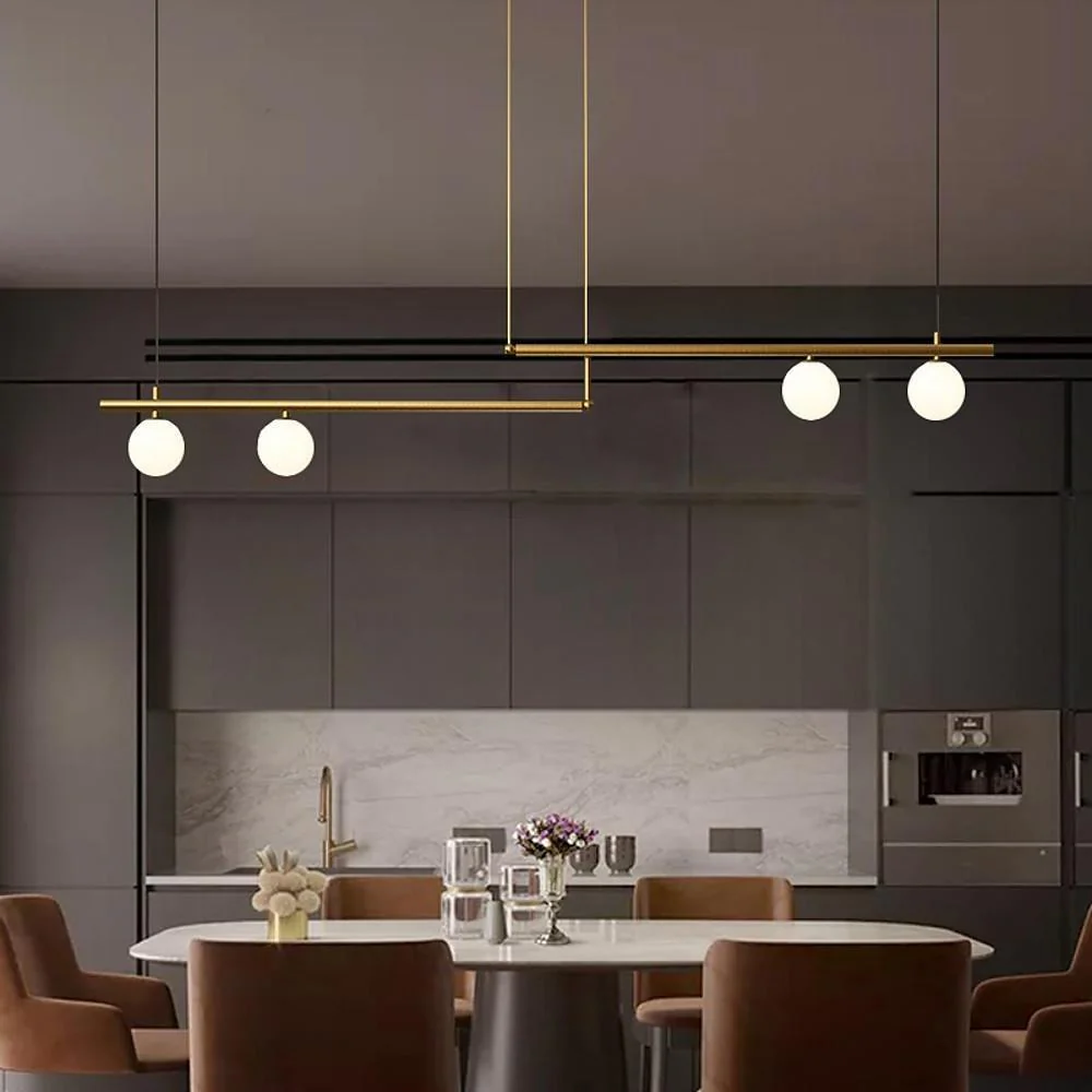 Refresh your home with this elegant modern gold linear pendant light designed to bring a refined minimalist touch to any space. The sleek linear frame paired with the spherical glass shade creates a timeless aesthetic, blending simplicity with artistic charm. The durable copper frame, finished with a smooth brass surface, ensures rust resistance and easy maintenance, while providing long-lasting use. The high-quality glass shade offers excellent light transmission, scattering the LED light evenly to create a bright yet gentle illumination, ideal for dining rooms, kitchens, island lighting, cafes, and other modern spaces.