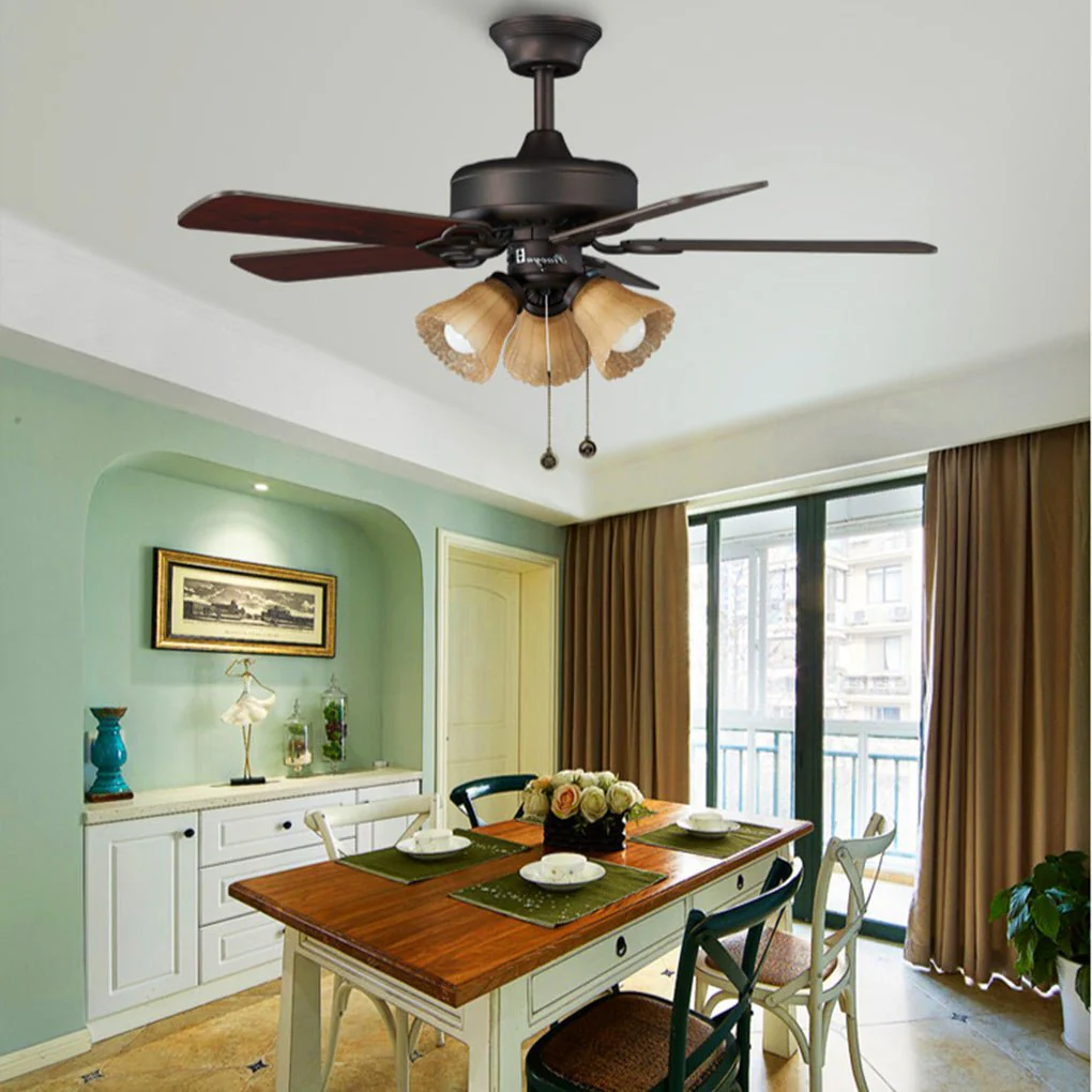 - This hanging high-quality wood blade ceiling fan lamp, which is stable and safe. This fan lamp blade has different colors on both sides, which is firm and durable and not easy to deform or crack. The heat-resistant glass shade of this wood blade ceiling fan lamp has uniform light transmission and will not turn yellow. The pure copper motor makes this unique ceiling fan run more smoothly and quietly. This pastoral hanging ceiling fan controls the switch by pulling the rope, which has a more retro style.
