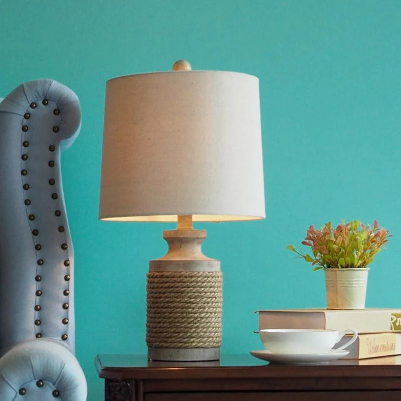 The rustic table lamp offers a rope wrapping look for bedrooms, living room lighting and more. It features a segmented stone base in a gray color. The base has been crafted from carefully polished process to have a graceful look that's ideal for rustic modern and coastal style rooms. Up top is a tapered oatmeal beige color drum shade that completes the look. This lamp adds a subtle and sophisticated ambiance to your surroundings.