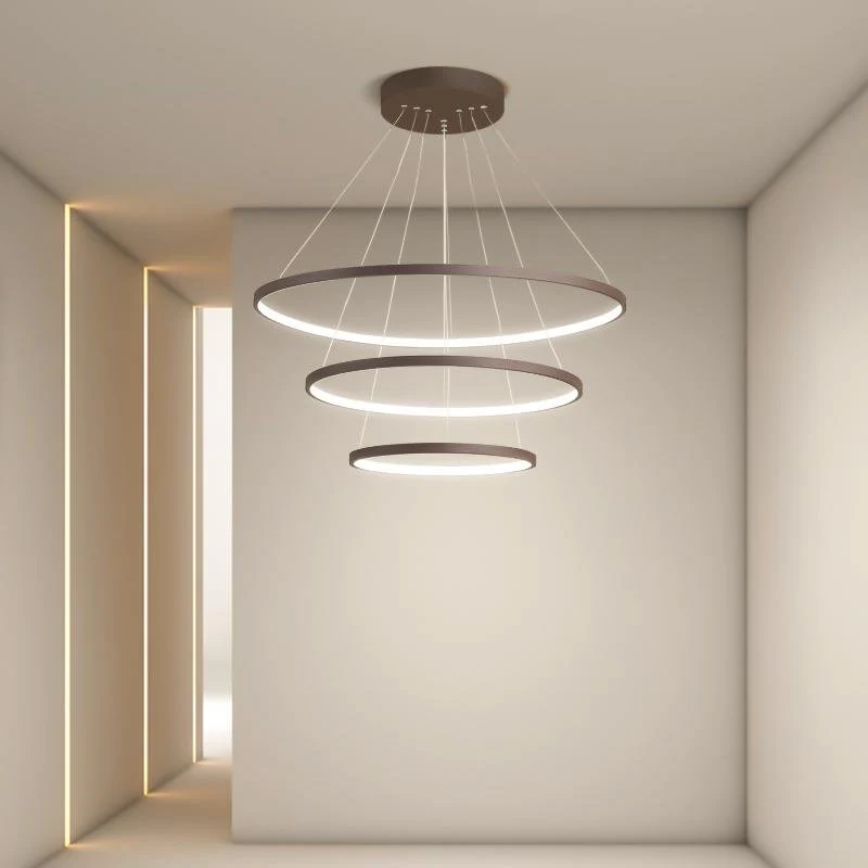 - A modernistic alternative to the traditional chandelier design, this circle ceiling light is an audacious and individualistic style statement. Descending from the gray ceiling mount are circles of light in decreasing sizes secured by fine wire; choose either three or four circles for your ceiling light.